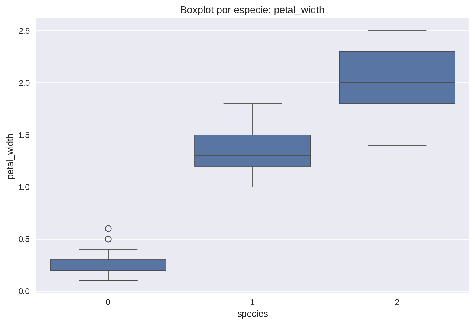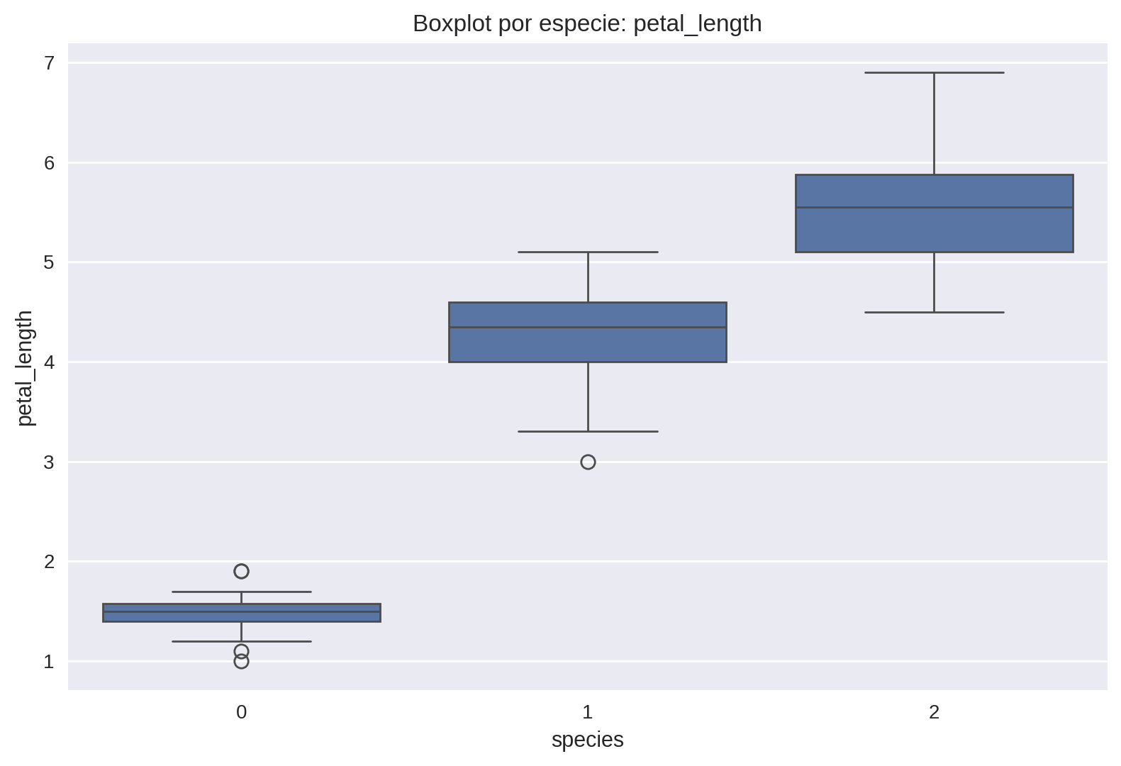 Con df.describe() se calcularon estadísticos básicos. Se observó que las variables de pétalos presentaban rangos más amplios y mayor poder discriminante que las de sépalos, sugiriendo que serían más útiles para clasificación.