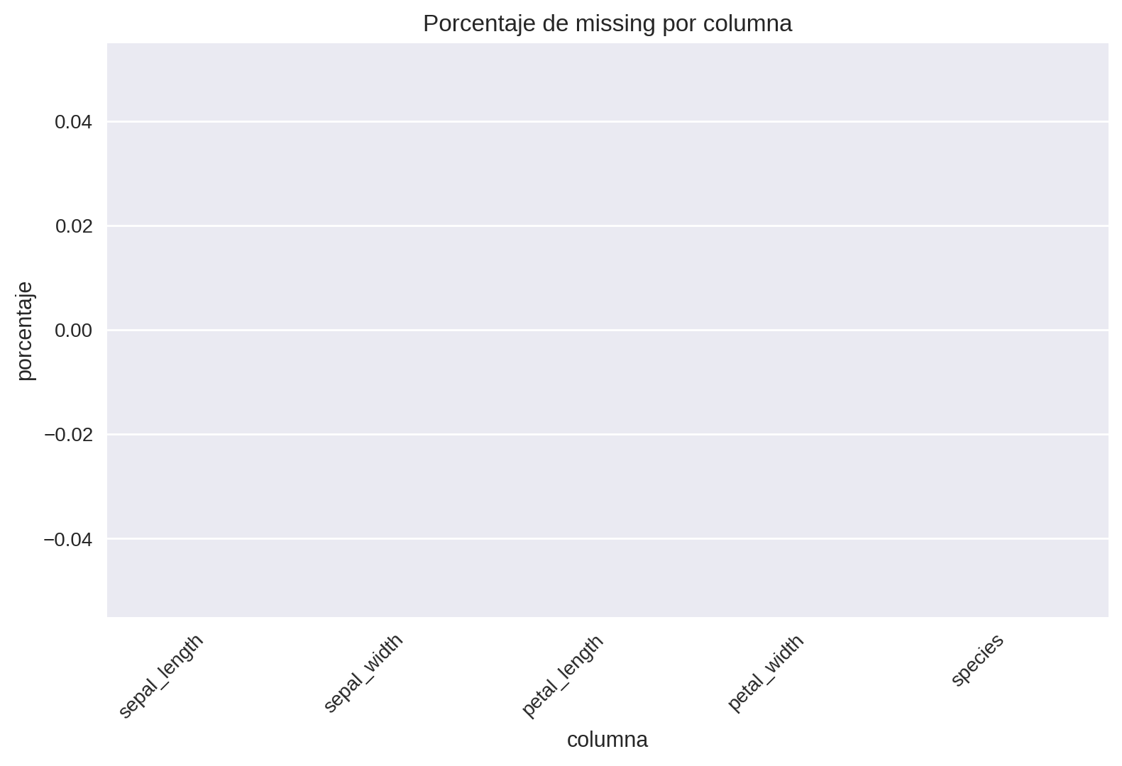 El gráfico de valores faltantes confirma que el conjunto de datos se encuentra completo, sin registros nulos o vacíos.