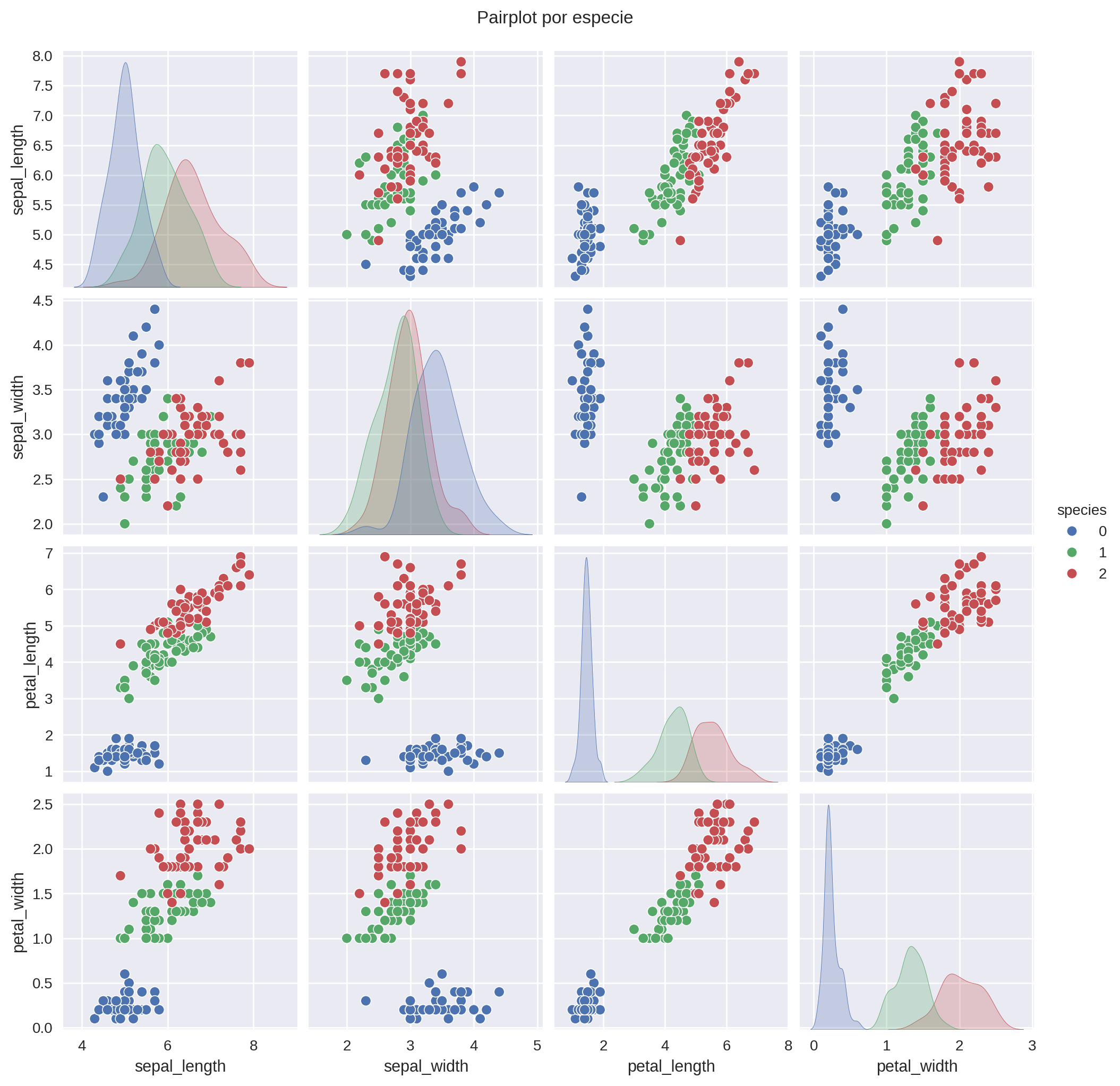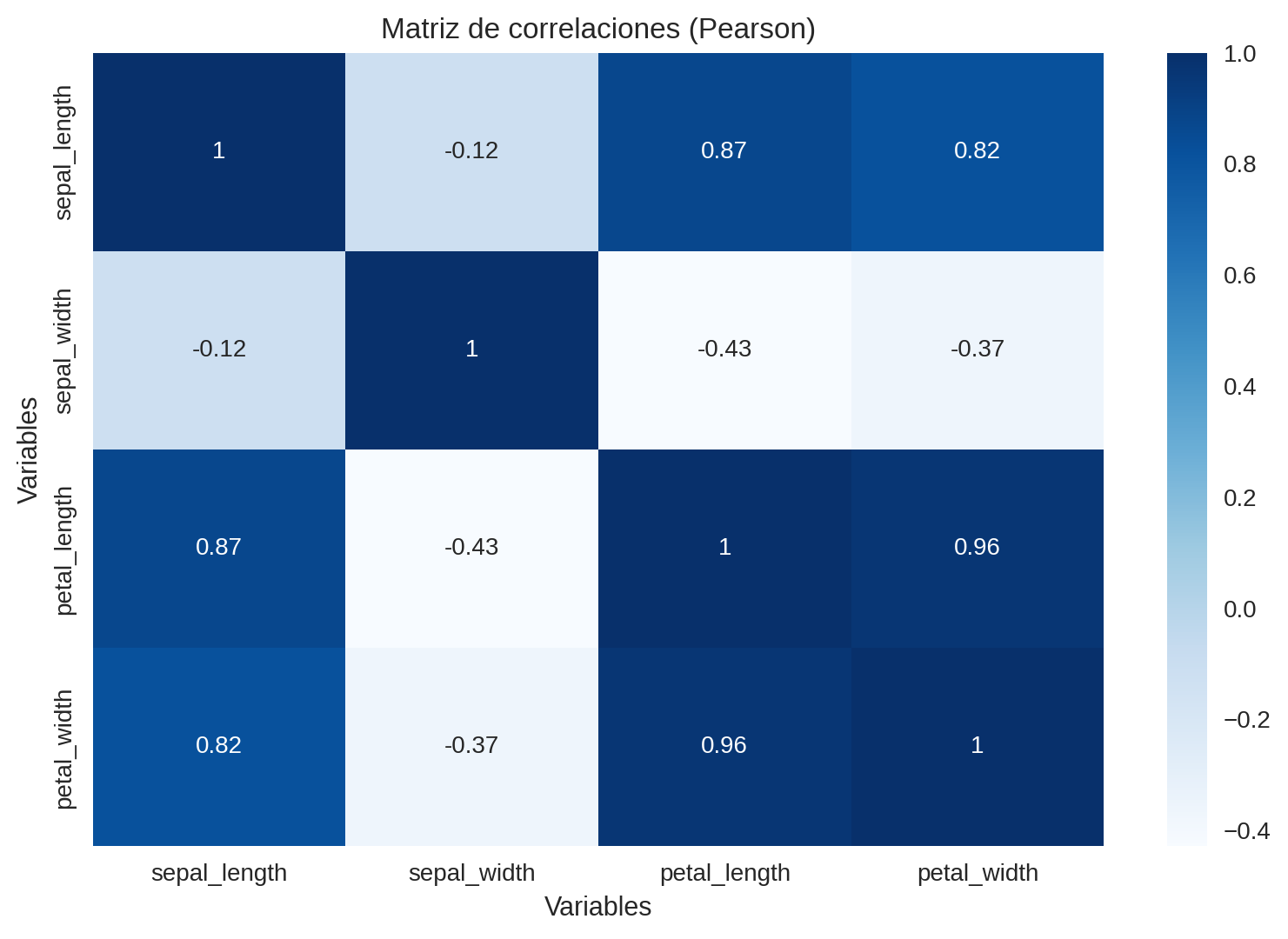 Se observa una correlación muy fuerte (~0.96) entre petal_length y petal_width, lo que sugiere que ambas aportan información similar y pueden funcionar como variables predictoras redundantes en un modelo de clasificación.