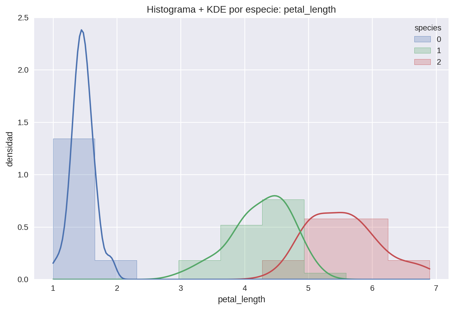 El histograma permite visualizar la distribución de petal_length por especie.