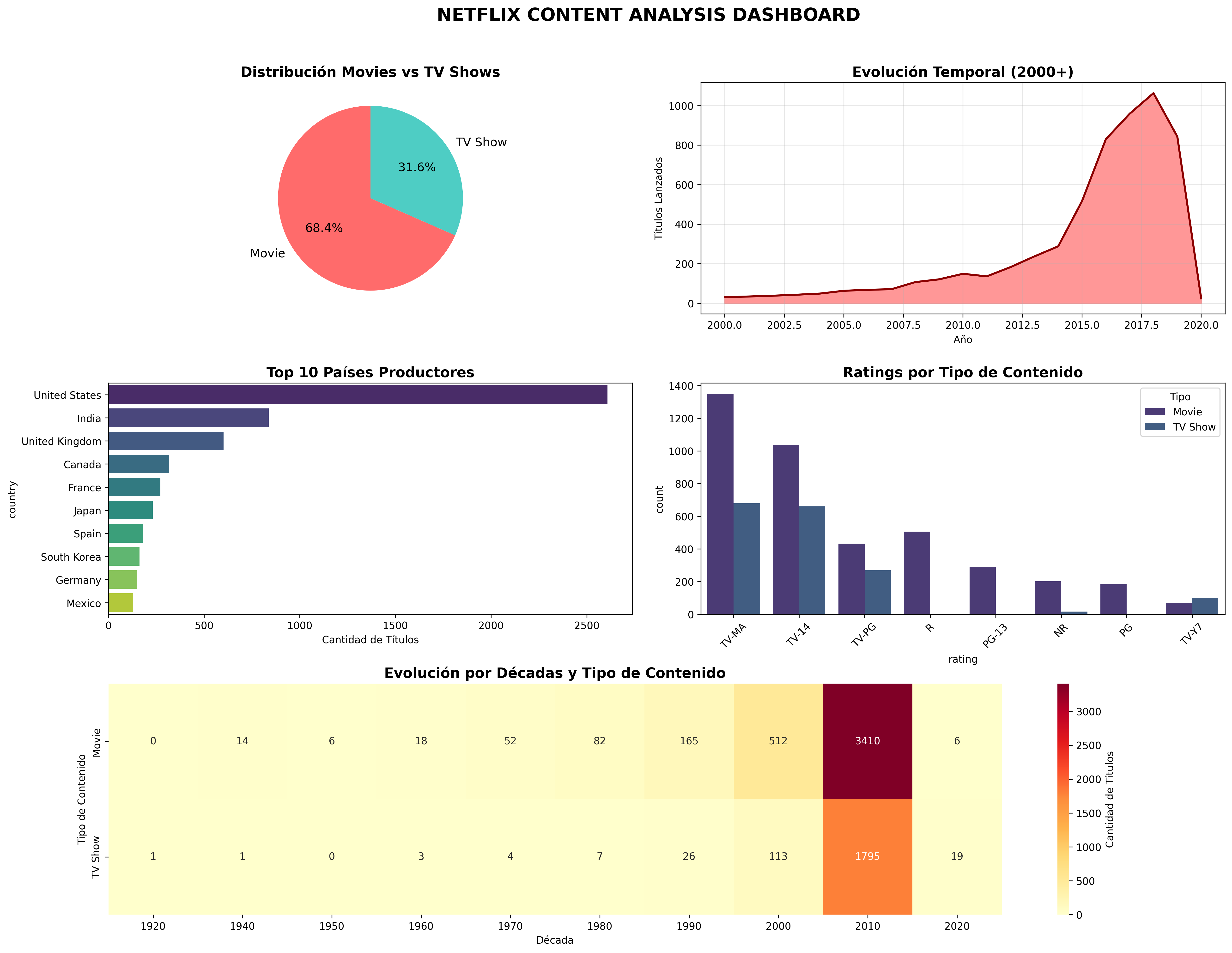 El dashboard integrador permite observar de forma global las dinámicas principales del catálogo de Netflix: