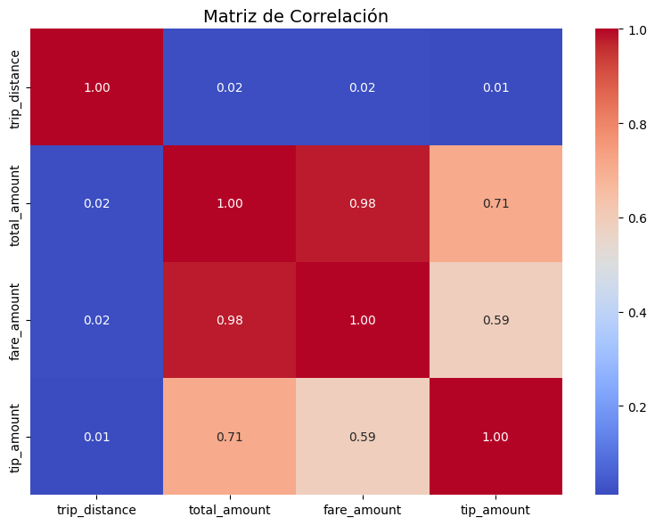 La matriz de correlación muestra una relación muy alta entre total_amount y fare_amount (0.98), una correlación moderada entre tip_amount y fare_amount, y una baja asociación entre trip_distance y los montos, lo que sugiere que la tarifa total está más influida por recargos y componentes fijos que por la distancia recorrida.