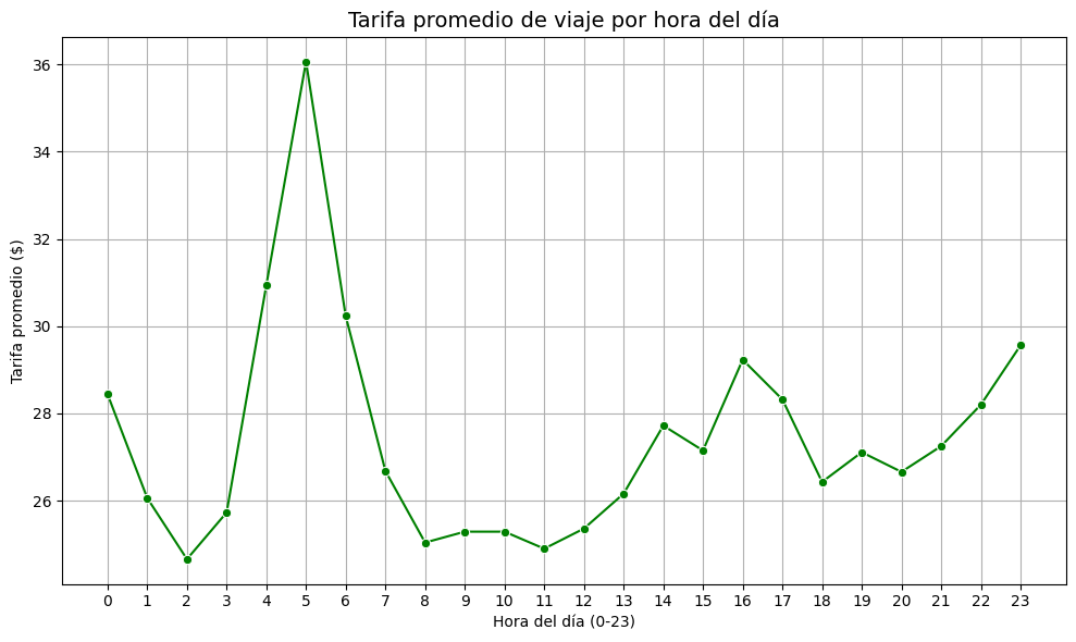 Se observa una variación horaria en las tarifas, con valores más altos en la madrugada (alrededor de las 04:00–05:00) y un segundo incremento al atardecer, coincidiendo con los picos de tránsito.