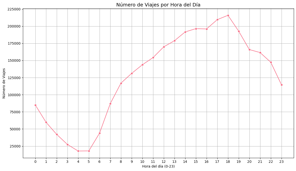 La distribución horaria evidencia una baja actividad entre las 03:00 y las 05:00, seguida por un aumento sostenido hacia las horas laborales y un máximo de demanda entre las 17:00 y las 19:00.