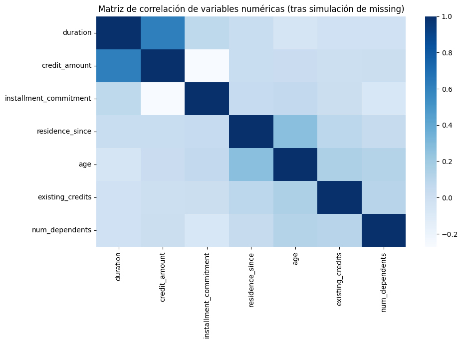 ageoexisting_creditsno muestran correlaciones relevantes, lo que sugiere baja multicolinealidad. - La simulación de missing data mantuvo la estructura general, permitiendo evaluar cómo responderían los métodos de imputación.