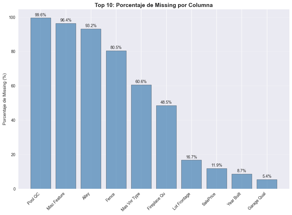 Top 10 de columnas con mayor porcentaje de missing¶