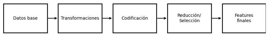 Este esquema refleja las etapas clave del feature engineering: partir de los datos base, generar transformaciones, codificar variables, aplicar reducción o selección y obtener un conjunto final de features listo para modelado.