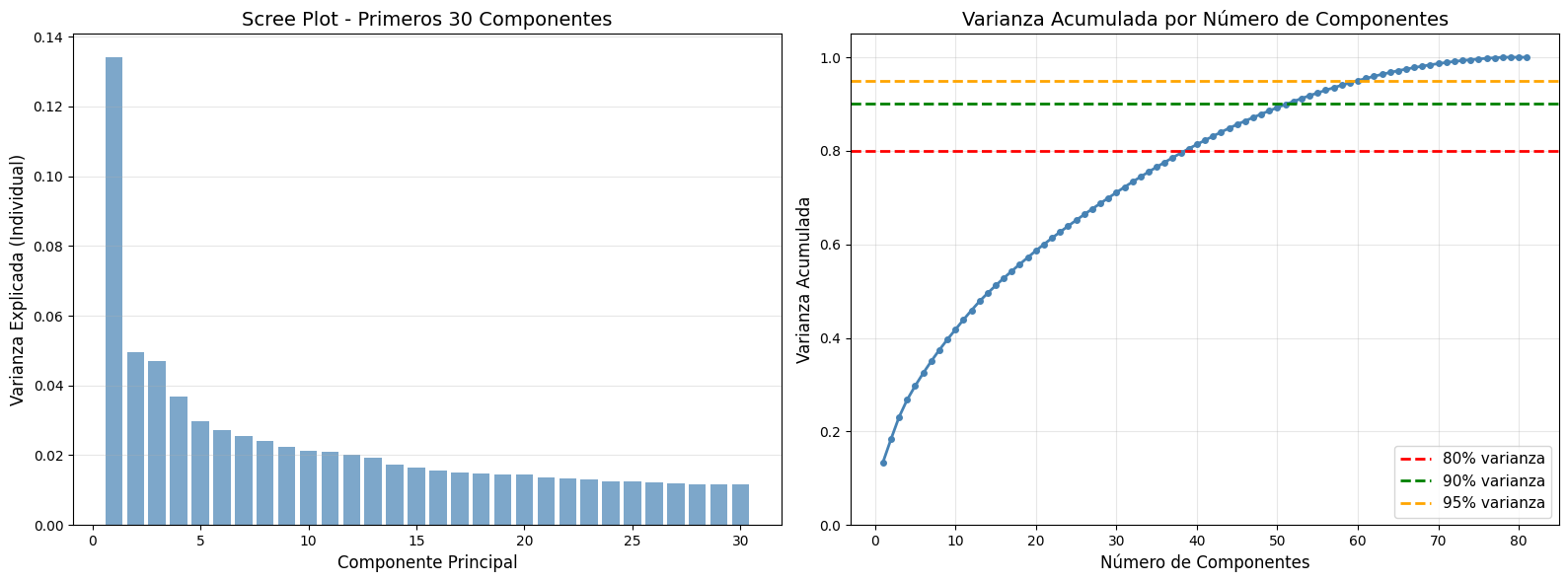 - Selección de componentes por umbral de varianza (80%, 90%, 95%).