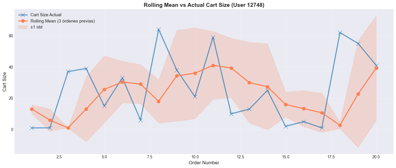 Esta visualización compara la serie original de tamaño de carrito por orden con un rolling mean de 3 periodos. La línea suavizada permite captar la tendencia subyacente eliminando ruido, mientras que la banda de ±1 desviación estándar refleja la volatilidad del usuario.