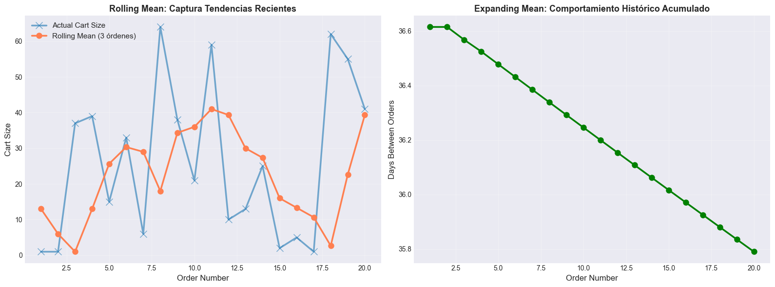 Las lag features permitieron capturar la proximidad entre compras, mientras que las rolling windows reflejaron la estabilidad o variabilidad reciente del comportamiento del usuario. Las expanding windows aportaron una visión acumulada de la relación del cliente con la plataforma.