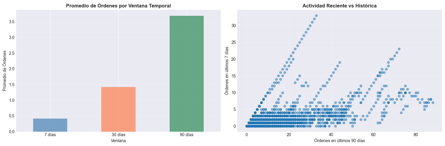 Los promedios de órdenes en ventanas de 7, 30 y 90 días muestran cómo los valores se estabilizan al aumentar la ventana. El scatter de actividad reciente vs histórica revela clusters y variaciones útiles para segmentación y predicción.