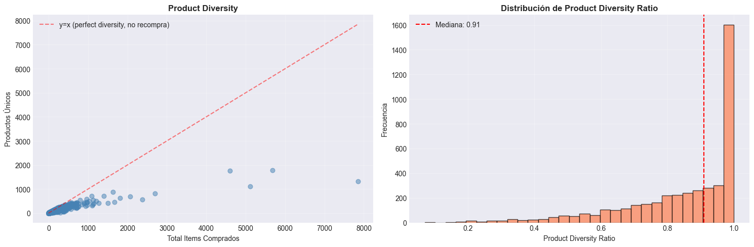 El scatter compara cantidad total de ítems vs diversidad de productos. La línea roja representa diversidad perfecta. El histograma confirma que la mayoría de usuarios tiene diversidad alta, lo cual impacta directamente en estrategias de recomendación.