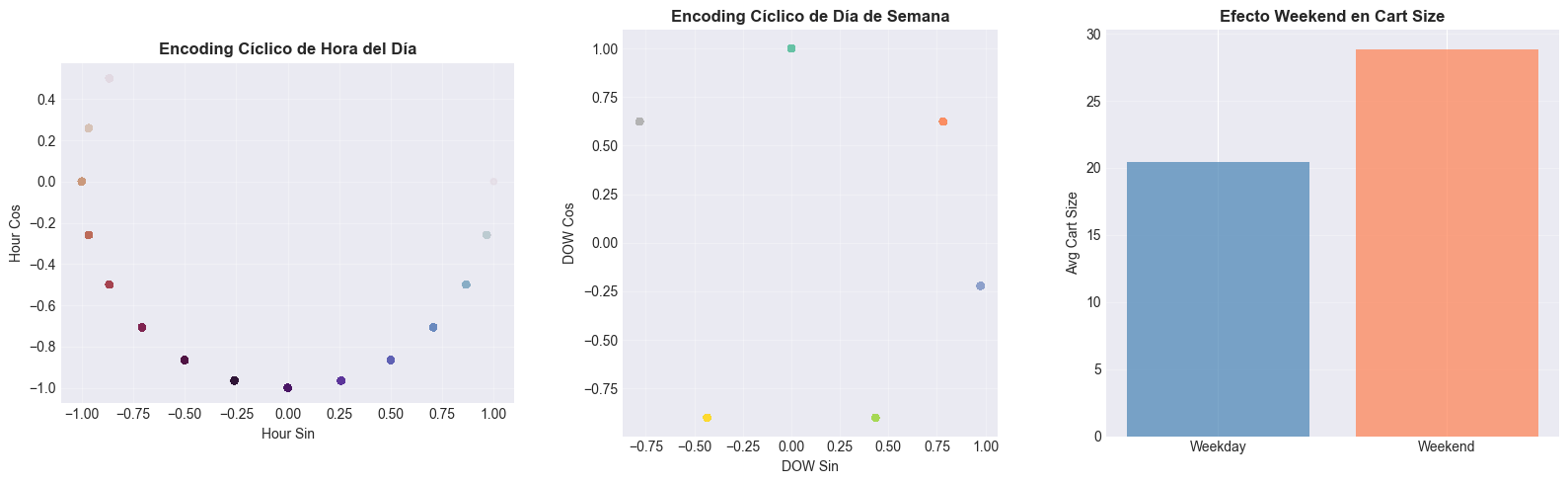 Las codificaciones cíclicas preservan periodicidad en hora y día. La barra de la derecha muestra que el tamaño del carrito aumenta los fines de semana, validando la construcción de features temporales.