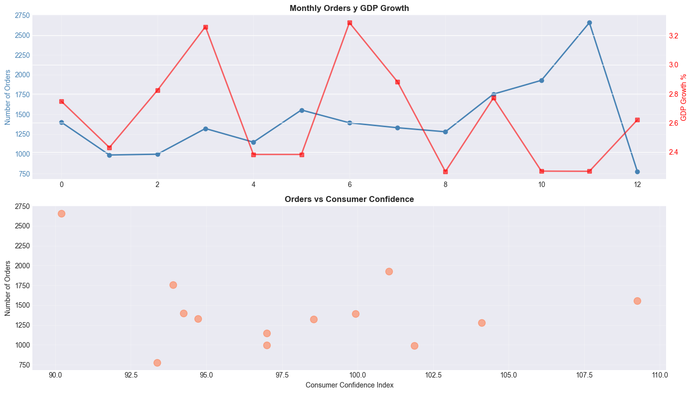 Existe paralelismo entre actividad económica y volumen mensual de órdenes. El scatter con el índice de confianza del consumidor muestra una tendencia positiva, indicando sensibilidad del consumo al contexto macroeconómico.
