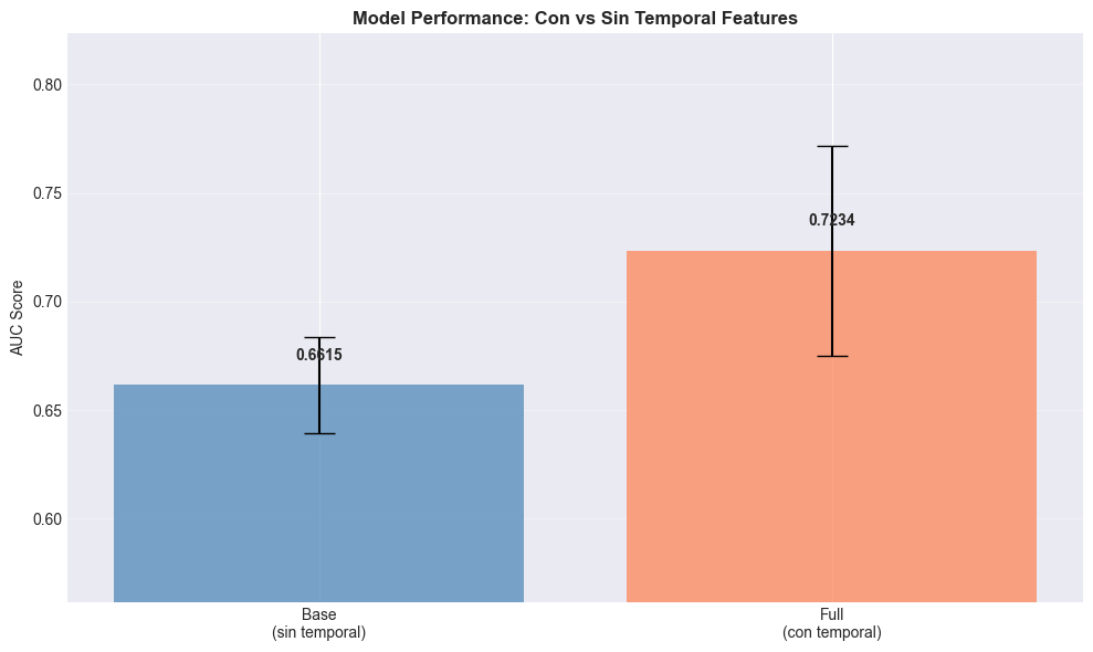 El AUC mejora de ~0.66 a ~0.73 al agregar variables temporales, demostrando que aportan señal valiosa. El intervalo de error confirma que la mejora es consistente.