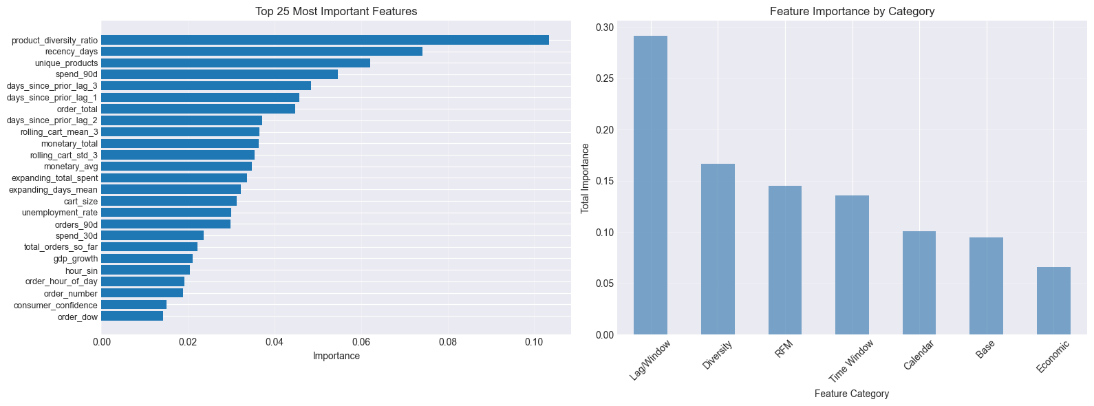 - Ranking global y por categorías: lag/window, RFM, calendar, external, base.