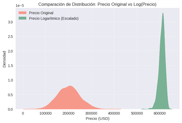 La transformación logarítmica del precio reduce la asimetría de la distribución, generando una forma más cercana a la normal. Esto mejora la estabilidad de los modelos lineales y evita el sesgo hacia propiedades con precios extremos.