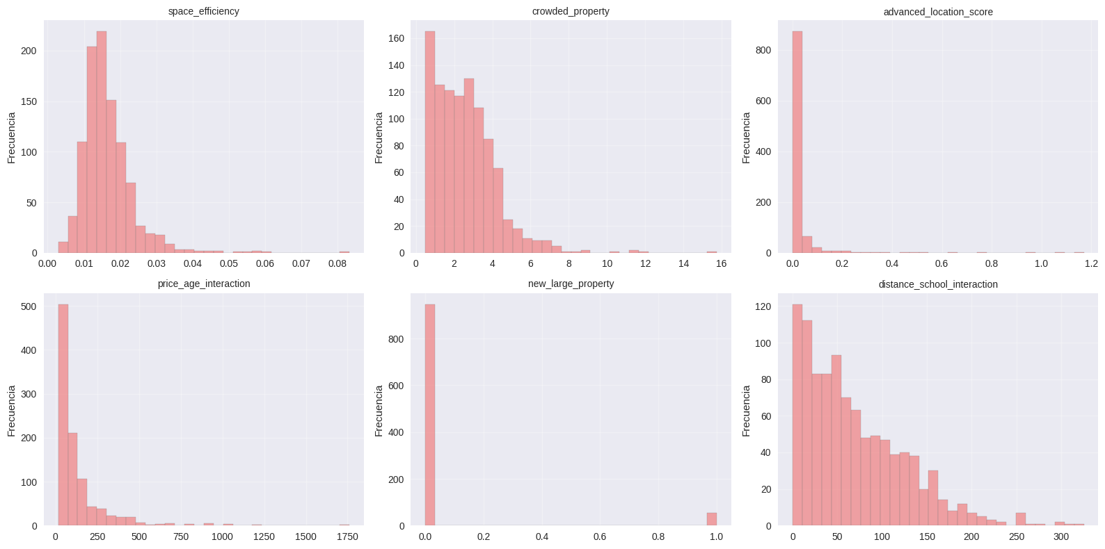 Las features derivadas como space_efficiency, crowded_property y distance_school_interaction presentan distribuciones asimétricas. Esto sugiere la presencia de propiedades extremas y la necesidad de escalado o transformación antes del modelado.