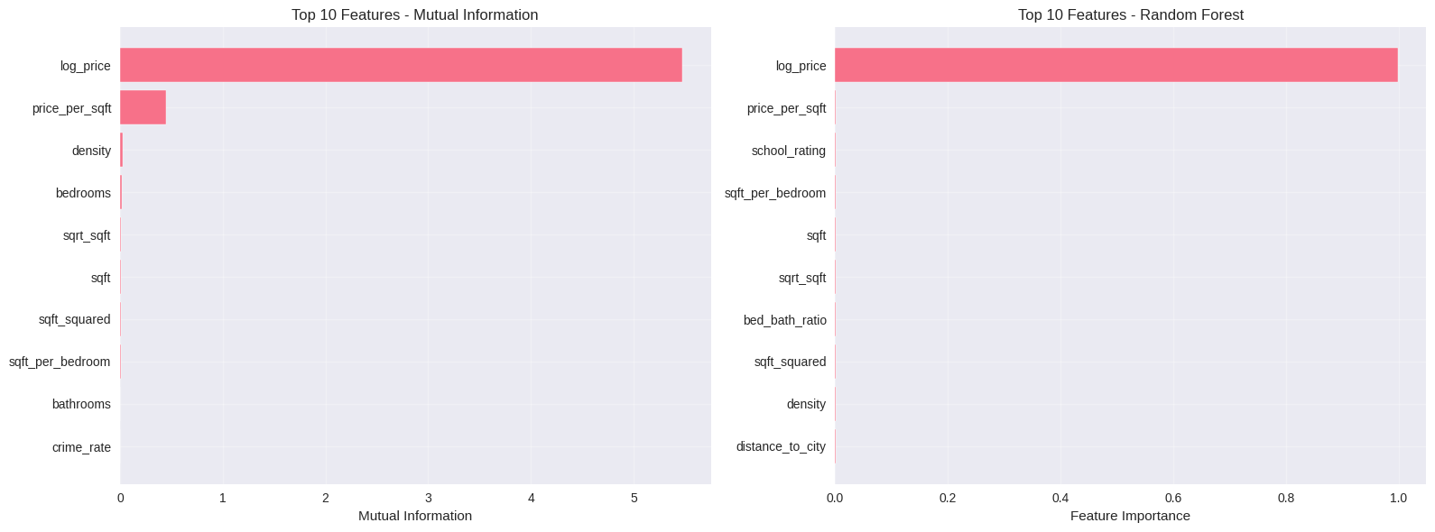 Tanto la información mutua como el modelo Random Forest destacan log_price y price_per_sqft como las variables más influyentes. Esto valida su peso en la predicción y sugiere una relación no lineal con la variable objetivo.