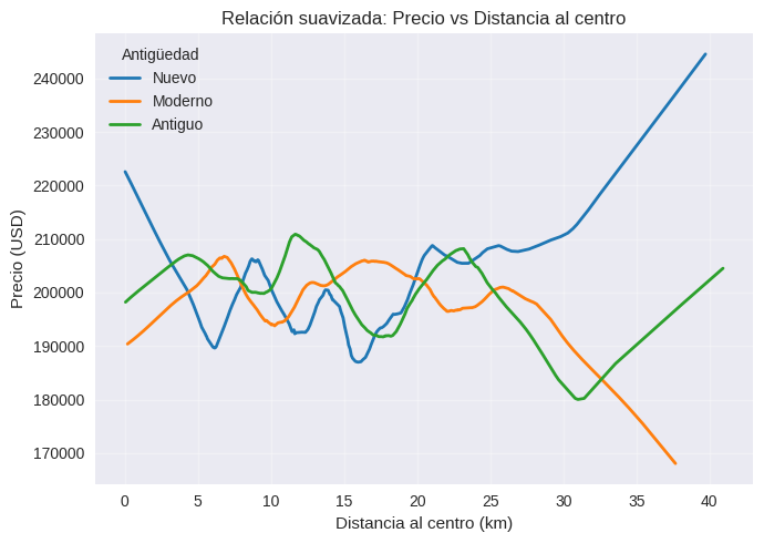 Relación suavizada: Precio vs Distancia al centro¶