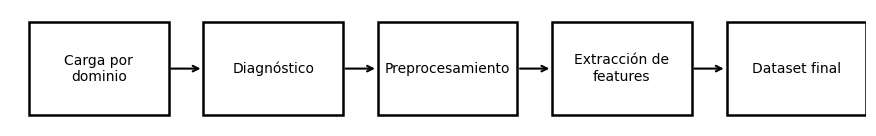 Este flujo resume el trabajo por dominio en la UT4: cargar datos geoespaciales, de imágenes y audio, diagnosticarlos, preprocesarlos y extraer features específicos para formar un dataset final utilizable.