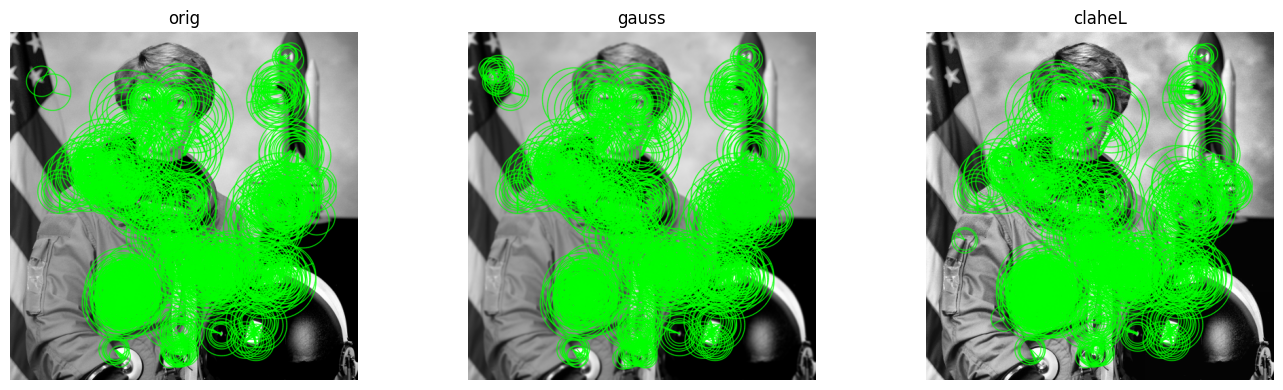 5. Keypoints en Original, Gaussian y CLAHE¶