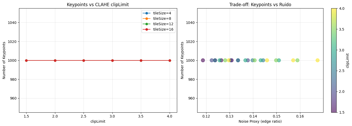 La cantidad de keypoints se mantiene prácticamente estable frente a variaciones de clipLimit o niveles de ruido. Esto prueba una alta robustez del detector y de las transformaciones aplicadas.