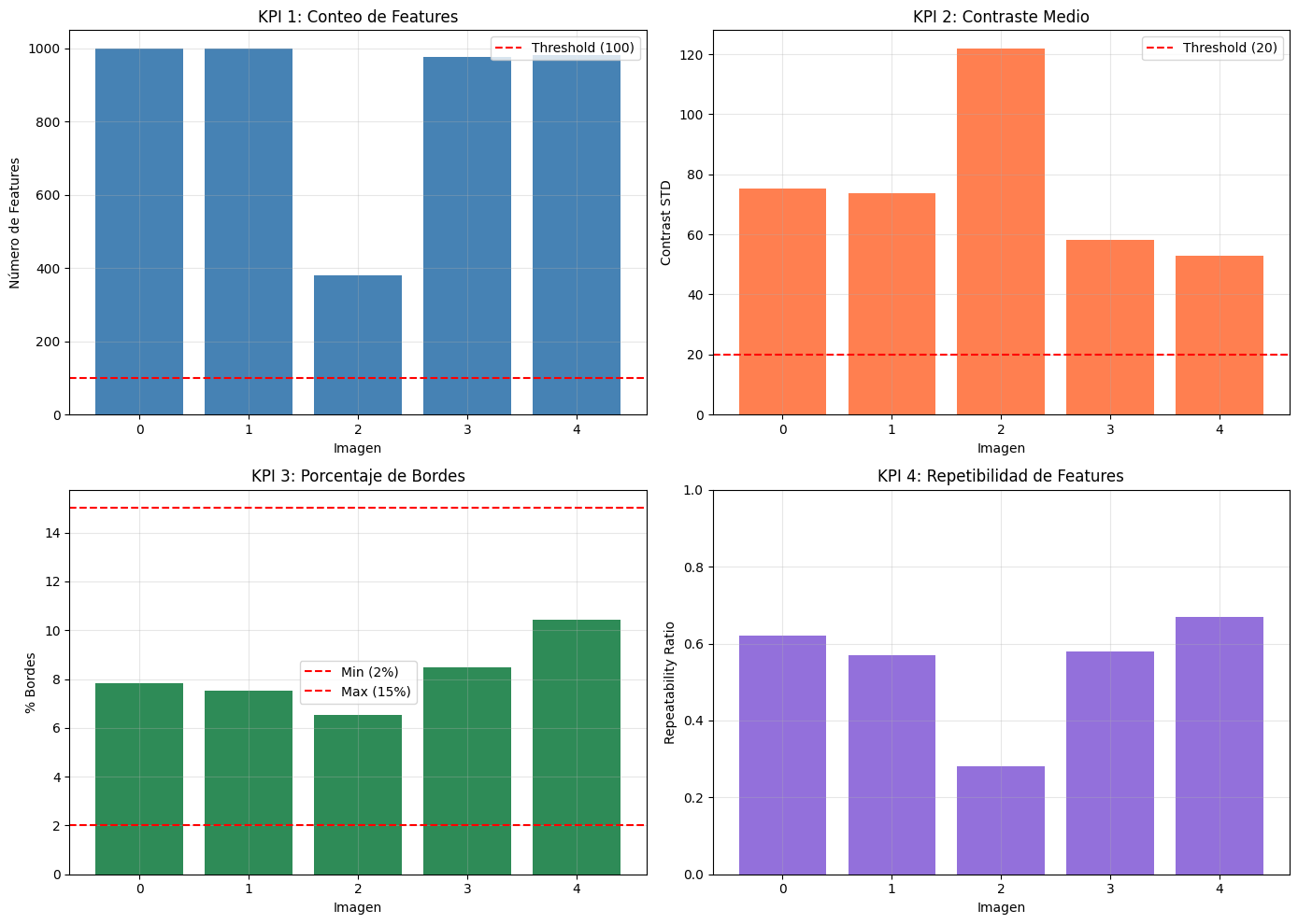 El uso combinado de diagnóstico visual, métricas (STD, edge_ratio, keypoints) y matching permitió evaluar objetivamente la utilidad de cada técnica.